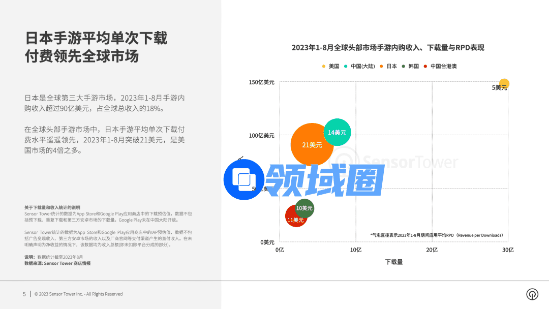 作为全球第三大手游市场,日本2023年1-8月手游内购收入超过90亿美元,占全球总收入的18%。日本手游平均单次下载付费水平遥遥领先,2023年1-8月突破21美元,是美国市场的4倍之多。