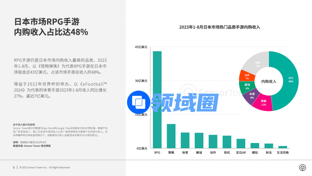 RPG手游仍是日本市场内购收入最高的品类,2023年1-8月,以《怪物弹珠》为代表RPG手游在日本市场吸金近43亿美元,占日本手游总收入的48%。