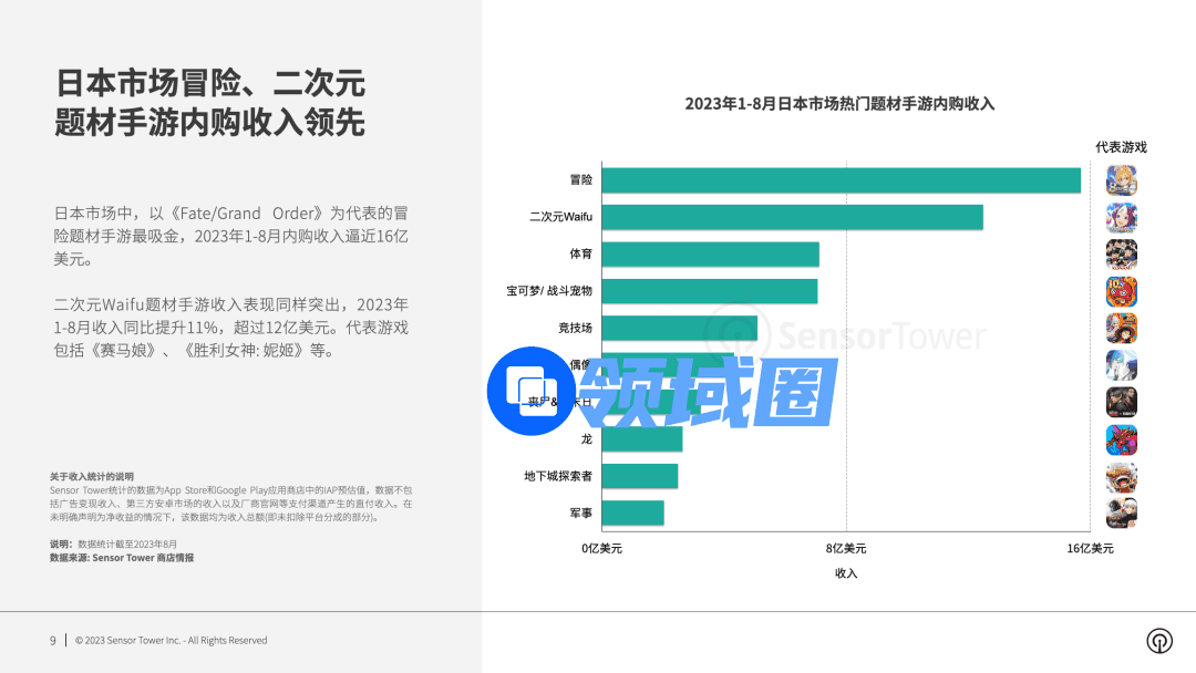 在题材方面,以《Fate/Grand Order》为代表的冒险手游在日本市场最吸金,2023年1-8月收入逼近16亿美元。二次元Waifu题材手游收入表现同样突出,2023年1-8月同比提升11%,超过12亿美元。