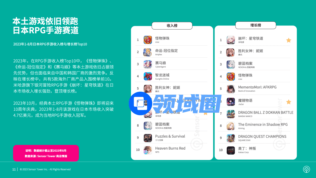 在RPG手游收入榜Top10中,《怪物弹珠》等本土游戏依旧占据领先优势,但也面临来自中国和韩国厂商的激烈竞争。其中有5款海外厂商产品入围增长榜前10,来自米哈游的《崩坏:星穹铁道》位列榜首。