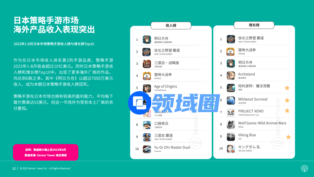 作为在日本市场收入排名第2的手游品类,策略手游2023年1-8月收入超过10亿美元。更多海外厂商的作品入围策略手游收入榜和增长榜Top10。其中《明日方舟》以超过7000万美元收入,成为本期日本策略手游收入榜冠军。