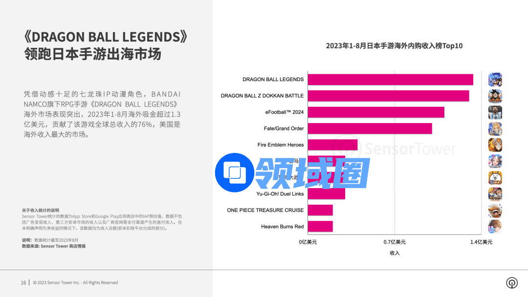 凭借七龙珠IP动漫角色,万代南梦宫旗下手游《七龙珠激战传说》和《七龙珠爆裂激战》2023年1-8月海外吸金超过1.3亿、1.2亿美元,成为出海收入最高的日本手游。