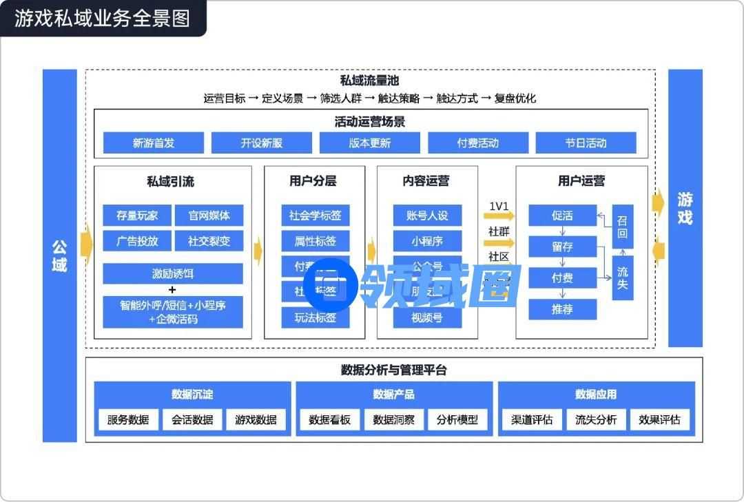 从测试期到首发再到运营期,可以说新游发行就是企业从零到一构建私域的最佳切入场景,究其原因,一方面新游没有历史负担,组织分工和配套建设更容易推进,另一方面,新游发行期间需要大规模买量,有利于私域快速起盘,反哺业务成长。