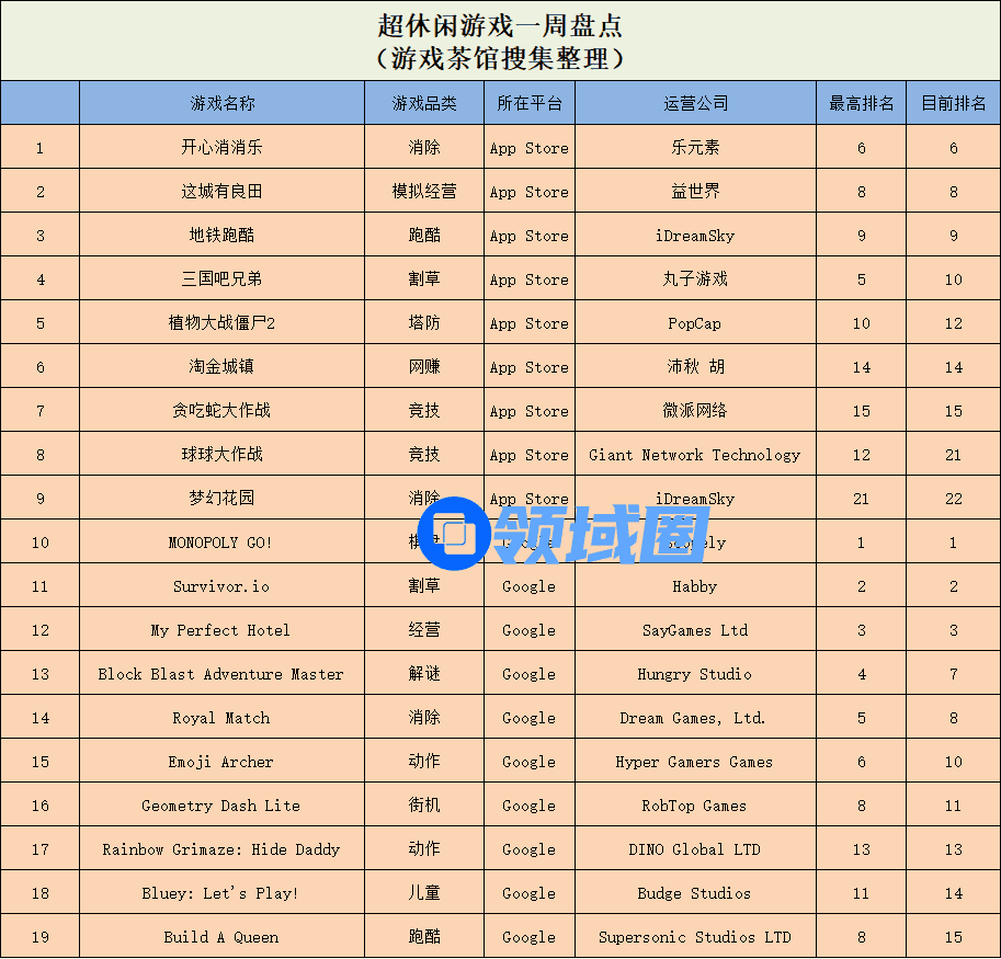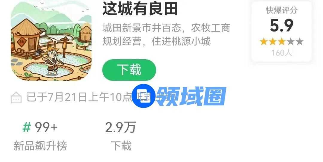 超休闲游戏:《这城有良田》重回TOP10,儿童新游冲榜