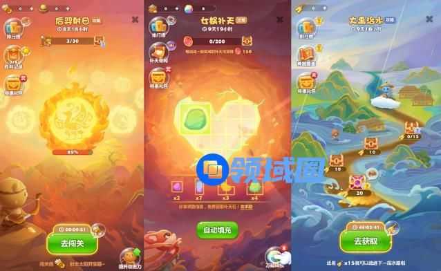其中,后羿射日玩法需要玩家收集并利用弓箭将天上悬挂的太阳逐一击落;女娲补天玩法需玩家收集并利用五彩石将天上的窟窿补齐;而大禹治水玩法则需要玩家通过收集治水神器耒耜,与大禹一道完成河道的疏通。