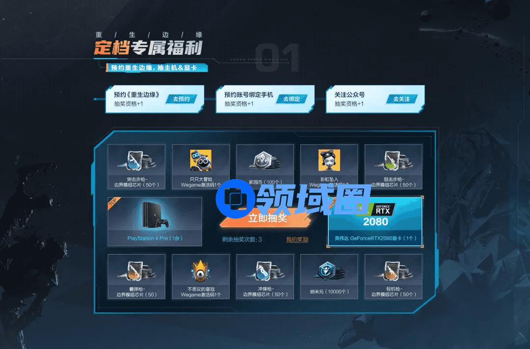 即日起至8月31日,用户点击阅读原文登陆活动页面预约《重生边缘》、预约号绑定手机或关注《重生边缘》官方公众号,均可获得1次抽奖资格,不仅有机会抽中家园币、纳米元、边界模组芯片等各种游戏内资源,还有机会赢取PlayStation 4 Pro、英伟达GeForce RTX 2080显卡等实物大奖。超多专属福利,只等各位勇士集结子午线!