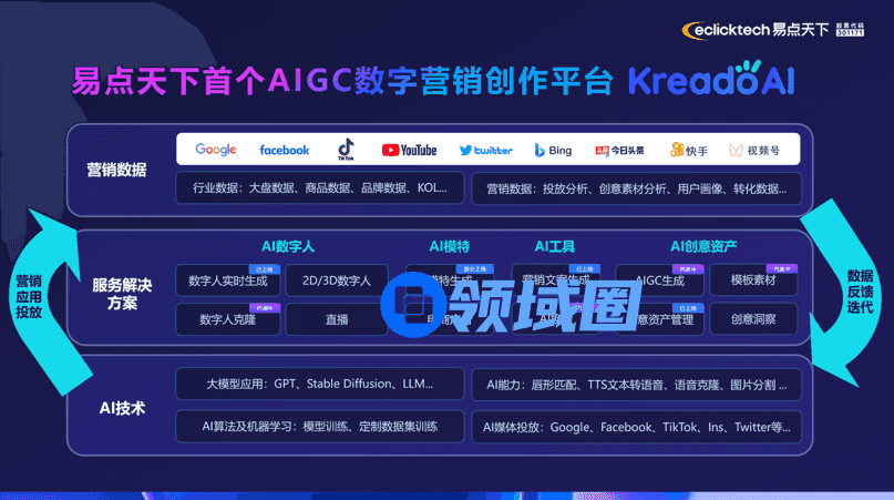 从营销AIGC化到AIGC营销化,数字内容的生产方式和消费模式正在进一步革新,AIGC将有望成为数字内容创新发展的新引擎。易点天下长期投身营销模式在人工智能领域的探索,通过不断拓展细分行业应用场景、已构建出从创意内容的生产,到投放策略的自动化,再到效果数据的回收、整体流量的优化。