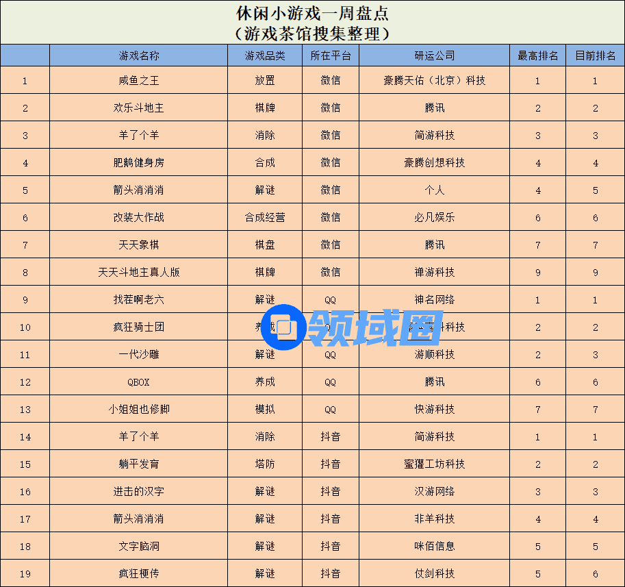 休闲新游周报每周统计微信小游戏、QQ小游戏、抖音小游戏、硬核小游戏以及App Store和Google Play上的新游爆款,并按照分类制作表格,将游戏排名情况等信息公布,希望给到行业同侪帮助。