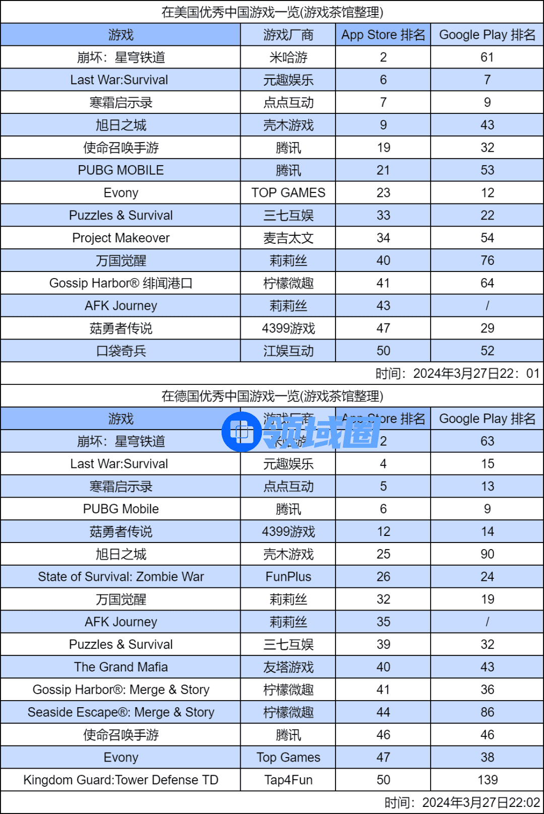 整理范围:美国区、德国区App Store、Google Play畅销榜前50名