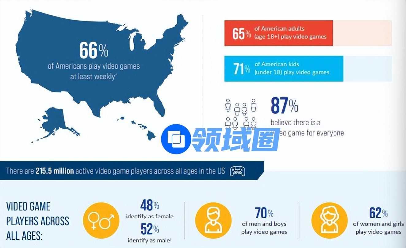 据美国娱乐软件协会发布的《2022年游戏行业的基本事实》,美国全年龄层活跃游戏玩家数为2.15亿人,超97%的玩家对游戏持有益态度。在设备的选择上,70%的玩家首选游戏设备为手机,52%的玩家选择主机,43%的玩家青睐PC,以及有60%的玩家倾向使用多种设备。