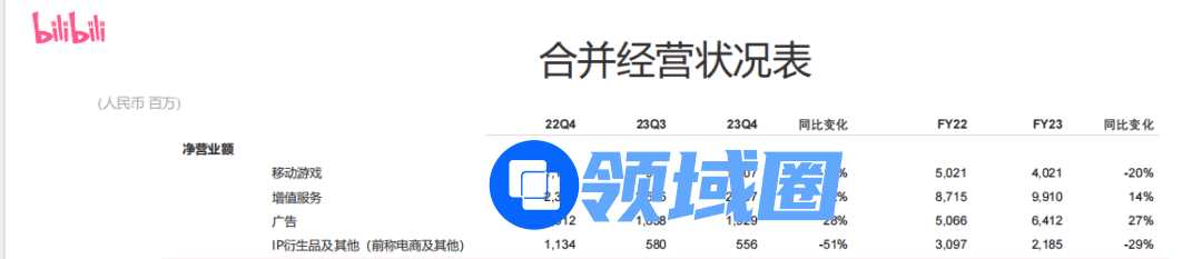 B站主要包含了四大业务,分别为游戏业务,增值服务,广告业务,IP衍生品及其他。2023年全年: