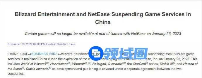 2022年11月,暴雪单方便发布公告称,和网易的代理合约将在2023年1月23日到期,而到期之后,双方将终止合作,不再续约。暴雪旗下游戏退出中国市场。