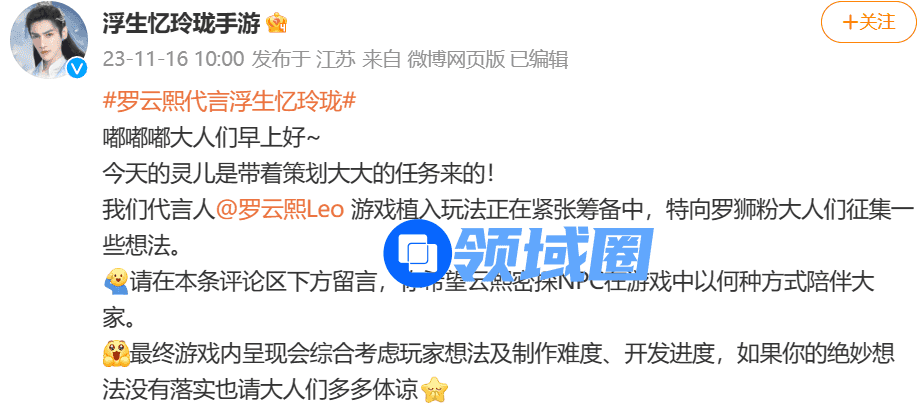 而这一切都建立在了解和满足玩家需求的基础上。浏览官方微博,可以看到,《浮生忆玲珑》在前期便展开了对玩家需求的调研。11月中旬,国风美男”罗云熙化身为游戏代言人“云熙密探”,一声“玲珑女孩”的召集令,直接引发了玩家对“玲珑女孩”的认领热潮。此后,游戏官号又陆续公布了“云熙密探”黑白双生的海报,调研玩家对代言人NPC玩法的青睐,持续营造一种悬疑感。