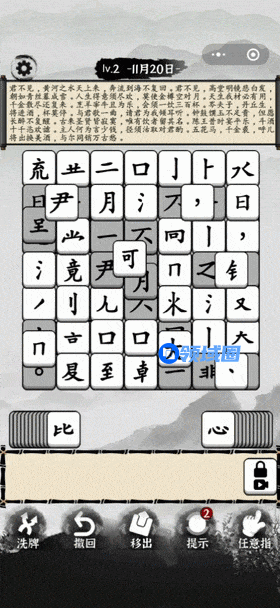 文字解谜以往最常用的游戏形式是答题,如今答题玩法的热度稍有退却,同时涌现出了一批将文字元素与其他解谜玩法相结合的产品。比如本周同样冲上了微信人气榜单前列的《汉字乐翻天》。该游戏将点击消除玩法和汉字结构进行了融合,在每个关卡当中,游戏会给出一段诗词,玩家需要通过将游戏主界面中的汉字结构进行组合,最终合成诗词中的所有汉字即可过关。