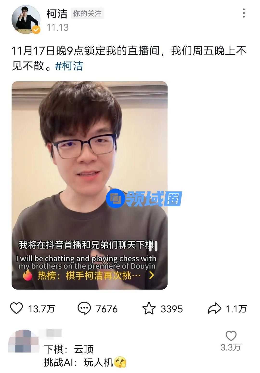 11月13日,柯洁便在抖音账号上发布视频预热,宣布将开启抖音首播——聊天之余“下棋、挑战AI”。但抖音粉丝凭借对他的了解,“心领神会”地将其解读为“金铲铲之战”和“金铲铲之战人机模式”。但一时间,柯洁是否会“暴打AI”的猜想也在抖音赚足了眼球。