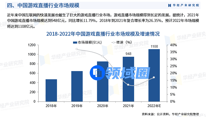 据华经产业研究院发布的《2023年中国游戏直播行业市场研究报告》 ,2021年国内游戏直播已达到948亿元,同比增长11.79%,并预计2022年市场规模将达到1108亿元;2021年,游戏主播数量也最多有621万人。