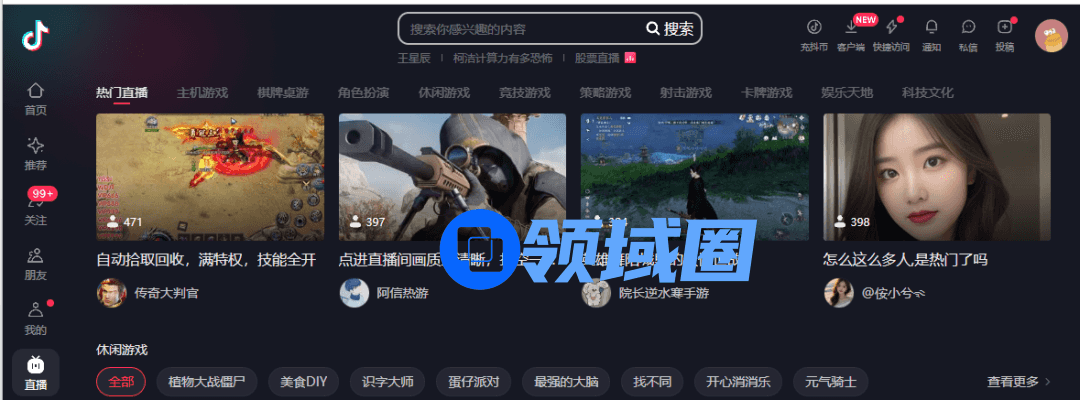 从多方面都能看出,抖音目前正在游戏直播上做资源倾泻,比如抖音将游戏直播频道放在较为显目的主界面,整体直播界面设计也较为严谨,内容也足够多元化。