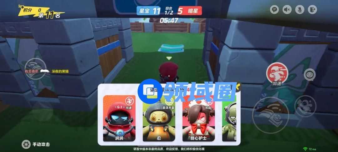 比如屡受好评的“生化追击”关卡,首测中由于蹲点防守和自动开火功能,暗星阵营想取得胜利,挑战很大。而本次测试加入了更多角色选择,暗星阵营的玩家可以使用加速、回血、隐身等不同技能相互配合,比如利用隐身技能做“老六”,偷偷迂回乘机偷袭。这种玩法上的策略进化变相为双方阵营的平衡性做出一定的调整。