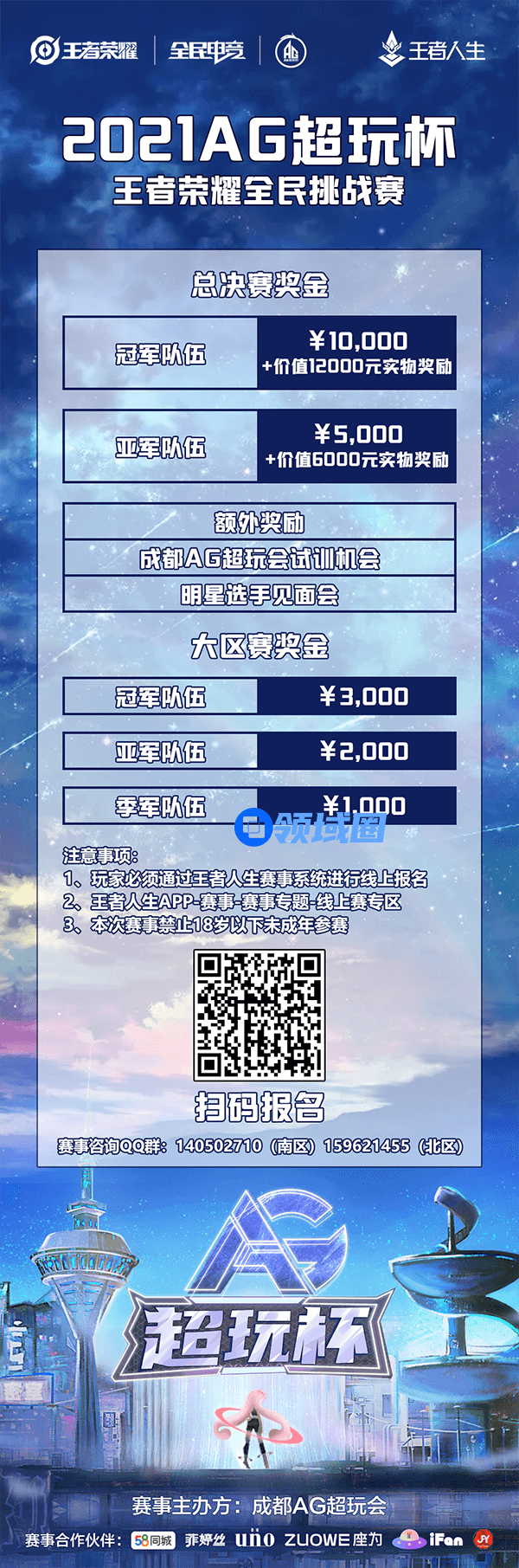 AG超玩杯王者荣耀全民挑战赛是AG电子竞技俱乐部官方举办的官方授权赛事,通过成都AG超玩会电竞圈影响力、粉丝号召力、明星选手知名度等等,为本届赛事打造一个高质量、高水准的全国大赛。AG超玩杯作为AG俱乐部举办的第二届王者荣耀全民大众赛事,依托成都AG超玩会面向全国王者荣耀爱好者。