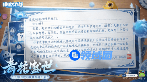 素胚勾勒出青花笔锋浓转淡,瓶身描绘的牡丹一如你初妆……青花瓷,是中国瓷器的主流品种之一,从唐宋开始就初见峥嵘,至明朝已成为瓷器主流。伴随着五一假期的临近,《球球大作战》邂逅中国景德镇瓷厂,将最能代表瓷都景德镇瓷器工艺的青花瓷带到波拉哩星,让每一个球宝都能在天青色浓淡变化中,感受古瓷之美。