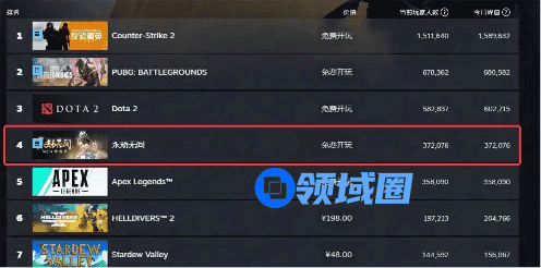 在今年3月刚出炉的网吧游戏热力榜中,《永劫无间》端游作为唯一国产游戏跻身前三。而Steam的数据于4月11日新赛季开启当日再次刷新,玩家同时在线人数突破37万,超越《Apex》,来到榜单第四。