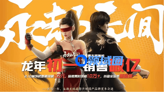 《永劫无间》的人气不仅体现在游戏赛道,还拓展到了直播带货赛道。2022年,《永劫无间》端游成为游戏行业内首个成功直播带货的产品,并屡屡创下销售额新高,龙年春节单场销售额更是直接破亿,同时观看人数超过10万,成为抖音全品类断层第一,创下游戏直播带货新历史。