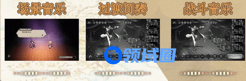 巧妙又独特的小前奏设计,使得场景音乐到战斗音乐形成完美过渡,呈现出了配乐中情感的递进和无缝衔接。
