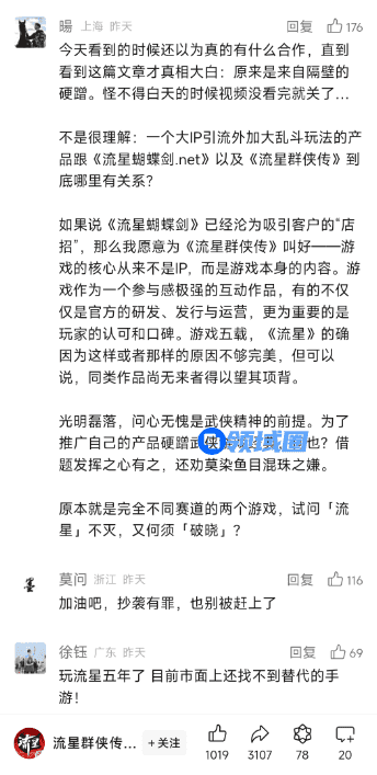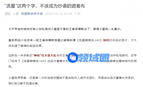 事发当晚,《流星群侠传》官方公众号发布了一篇名为《“流星”这两个字,不应该成为抄袭的遮羞布》的文章,指责《星之破晓》利用流星IP抢占市场,消费老游戏情怀。