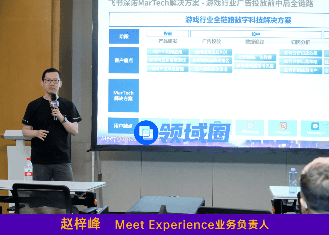 针对以上痛点,飞书深诺游戏行业CSM负责人高博带来了《游戏出海如何制胜全链路》的分享,他表示,海外发行的本质是以数据化的方式链接游戏产品和用户,飞书深诺旗下专注游戏出海的子品牌Meetgames能够在不同业务阶段全程陪伴赋能游戏企业海外发行,以专业定制化服务+一站式SaaS服务平台为出海游戏企业提供包括定制调研、产品测试、媒介采买、广告投放、创意素材、整合营销、SDK工具在内的各项发行服务,帮助国内游戏客户打破出海壁垒、降低出海门槛、快速起步走向海外。