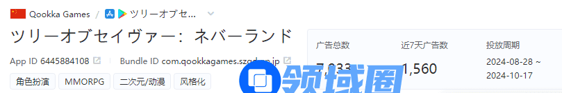 而据AppGrowing国际版,日本也是该款游戏投放广告数最多的地区。从8月开始铺量,总共投放素材数超7000余条。累计曝光估算量较高的素材多以“经典IP”、“手绘画风”和“不同角色及战斗画面”为关键词。