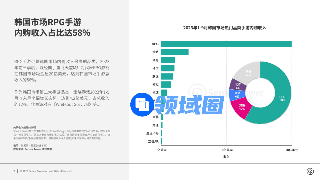 据Sensor tower《2023年韩国手游市场洞察》,韩国仍是国内厂商出海的重要地区。2023年前三季度,韩国手游畅销榜Top100产品中,海外游戏收入占比达到42%,其中中国发行商占比28%。从收入来看,RPG是韩国市场的头部手游品类,其次为策略游戏。
