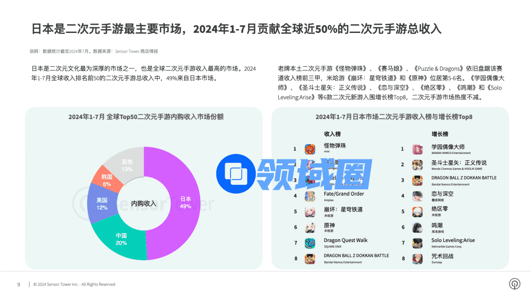 而在日本地区,在2024年上半年,收入最高的手游仍旧来自本土手游《怪物弹珠》《赛马娘》等,日本也是全球二次元手游收入最高的地区。较为有趣的是,在日本逐渐式微的乙游环境中,《恋与深空》备受欢迎,还成为贡献收入最高的地区。