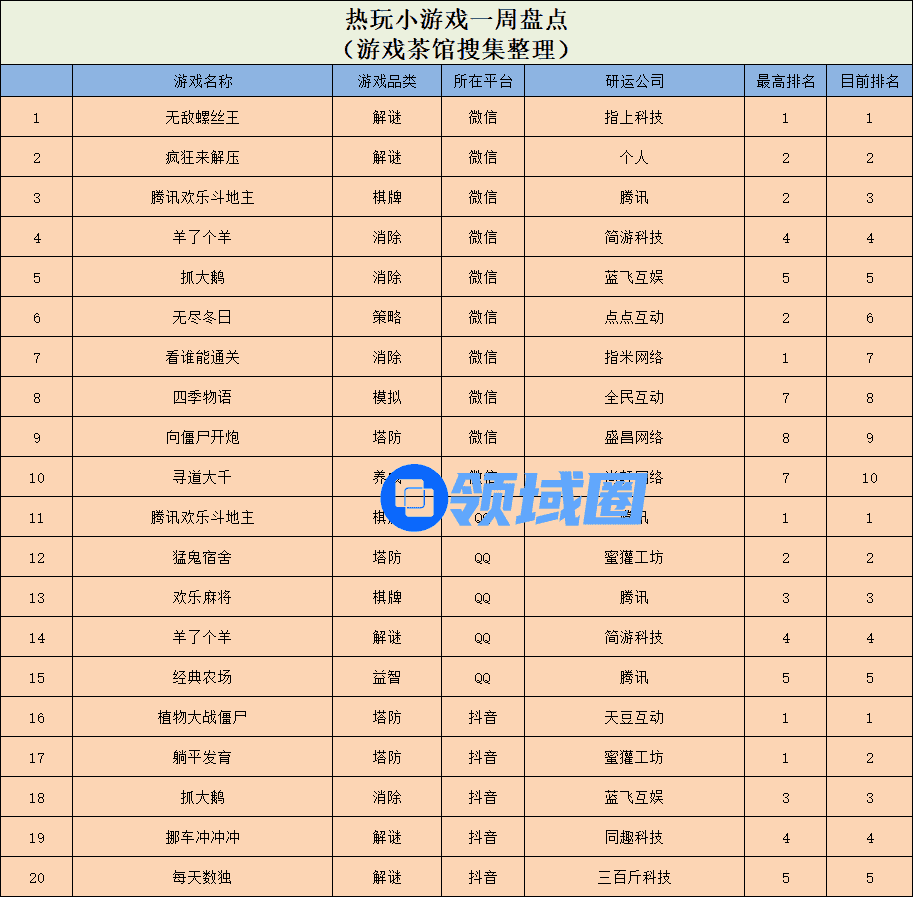 微信小游戏人气榜单TOP10中,两款解谜游戏《无敌螺丝王》和《疯狂来解压》分别拿下榜单第1和第2名,腾讯旗下经典棋牌《腾讯欢乐斗地主》则紧随其后,拿下人气榜单第3名。同时,全民互动的二合游戏《四季物语》本周热度持续,当前稳坐微信小游戏人气榜第8名。