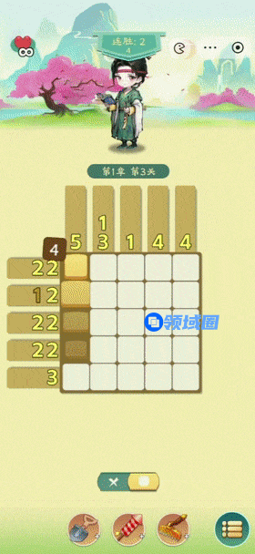 《每天数独》这款游戏虽然名为“数独”,不过其核心玩法并不是传统填写数字的数独游戏,而是根据表格四周的数字提示,对表格棋盘进行填色的“数图”玩法。每局游戏中存在一个n行n列的表格,且每行/每列开头都有一个数字,对应相应行/列的需要填色的格子数量,玩家们需要根据这些数字提示在表格中进行填色,最终完成关卡。