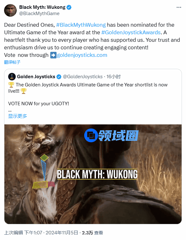 在成功入选后,《黑神话:悟空》官方账号也在推特上对这一结果表示了感谢,并附上了投票链接。不过在国外玩家社区中,《黑神话:悟空》的热度并不算顶流,对于金摇杆这么一个以海外玩家为主要受众的奖项,《黑神话:悟空》获得最终大奖的难度还是可想而知。