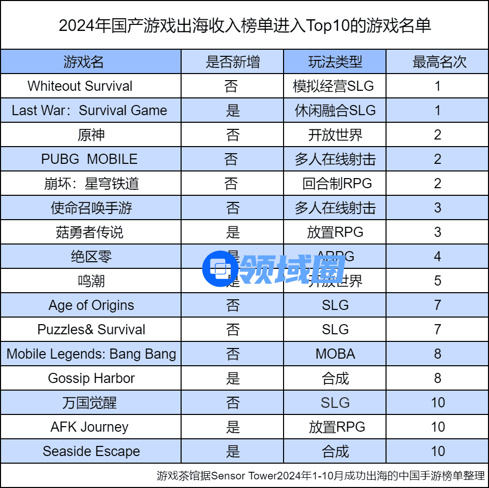 具体来说,2024年出海新游整体冲势迅猛。据Sensor Tower榜单统计,在2024年前10月,进入中国手游出海收入榜单Top10的游戏共计16款,其中,新入榜游戏共计7款,占比近一半。