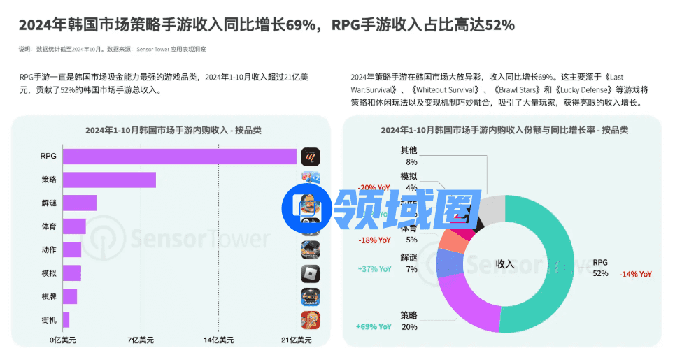 韩国的重要性为何再次被厂商挖掘?首先,韩国市场手游整体仍稳中有升。仅2024年前三季度,韩国市场收入就达到37亿美元,超过韩国地区2023年全年收入。其次,从题材来看,虽然以《天堂M》为代表的经典MMO手游在当地市场收入占比便超50%,但在2024年,得益于《Last War:Survival》《Whiteout Survival》等游戏的发力,策略手游在韩区收入也实现69%的增长。