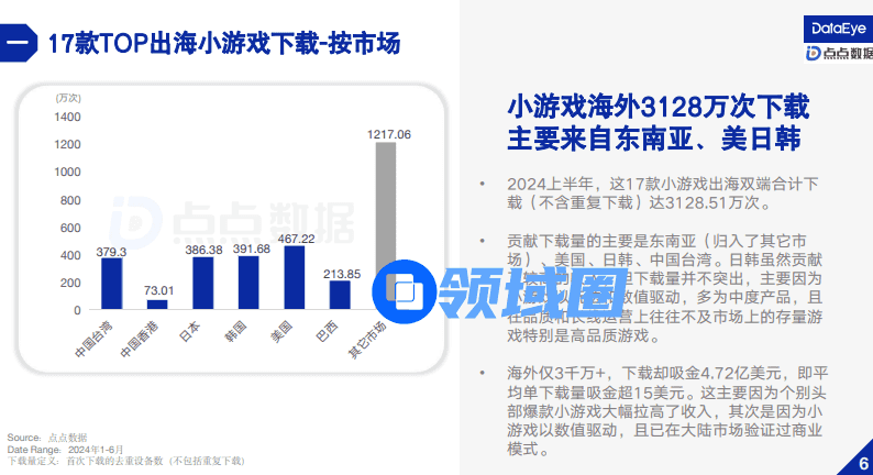与此同时,2024年,国产游戏也在东南亚获得较高下载量。据DataEye《2024年小游戏出海报告》,为平台统计的17款小游戏,贡献最高下载量的地区就是东南亚。而在MOBA品类,《王者荣耀》是7月东南亚地MOBA品类下载榜榜首,《Mobile Legends: Bang Bang》是该地区1-8月收入最高的手游,其下载量稳居东南亚下载榜亚军。其中,印尼是这款游戏下载量最高的市场,贡献了今年前8月全球总下载量的44%。