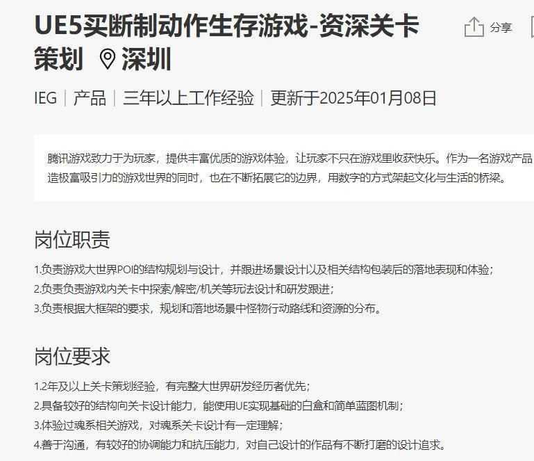 而在最近,有网友发现腾讯招聘也公布了UE5买断动作生存游戏资深关卡策划相关招聘信息,要求对魂系关卡设计有一定理解,似乎也石锤了上述爆料信息。
