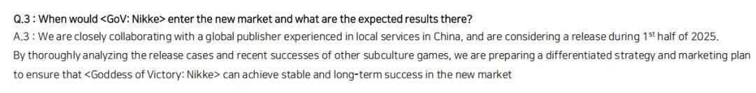 《胜利女神》凭借高质量的动画演出、独特的竖屏射击以及出色的角色设计,吸引了大量玩家关注。游戏在海外上线后成绩亮眼,有口皆碑,因此国服也备受玩家期待。《NIKKE》也成为了开发商Shift Up的收入支柱。据Shift Up去年Q3财报,《NIKKE》前三季度收入达1600亿韩元(约合人民币8.05亿元)。Shift Up在财报电话会上表示,正在与中国发行商紧密合作,计划将于2025年上半年上线。Shift Up表示,《胜利女神》将采取差异化的发行策略,以确保在新市场的成功。