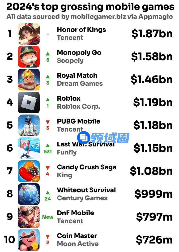 除《绝区零》,米哈游旗下手游《崩坏:星穹铁道》《原神》也在近期迎来版本及活动更新。据Sensor Tower,在12月,全新内容推动这3款游戏全球收入环比增长123%、132%和23%,推动米哈游移动端收入增长77%,米哈游目前在全球收入榜中排名第4。《崩坏:星穹铁道》是旗下最吸金的游戏,据AppMagic,其在2024全球收入榜中排名第12,刨除平台分成及第三方商店数据,其获得营收5.96亿美元。