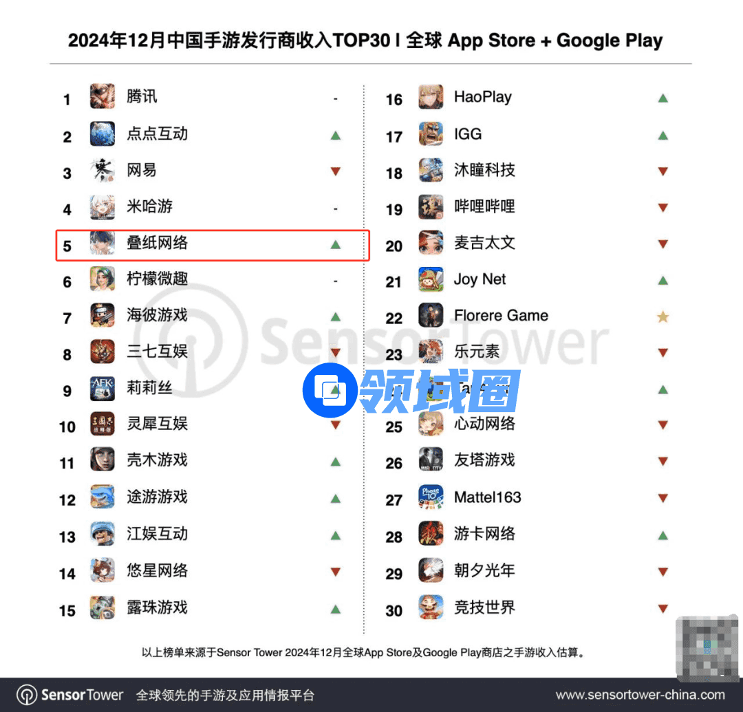 而点点互动出海黑马《Whiteout Survival》仍势不可挡。由Sensor Tower统计,这款游戏的市场收入在12月与海外和国内分别增长13%和9%。也拉动点点互动全球收入增长11%,令点点互动超越网易,首次获得中国手游发行商全球收入榜亚军。