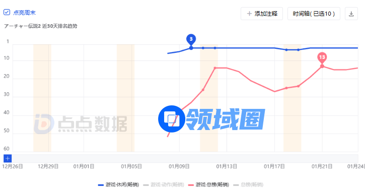 海彼游戏在2024年末爆款频出,于10月底和11月中旬在海外接连推出两款新游《卡皮巴拉 Go!》和《弓箭传说2》,推动海彼游戏在中国手游发行商全球收入榜中大涨10名,来到第9。近期1月,肉鸽射击休闲手游《弓箭传说2》则继续在美国、日本等地区推出,也获得了不错成绩。