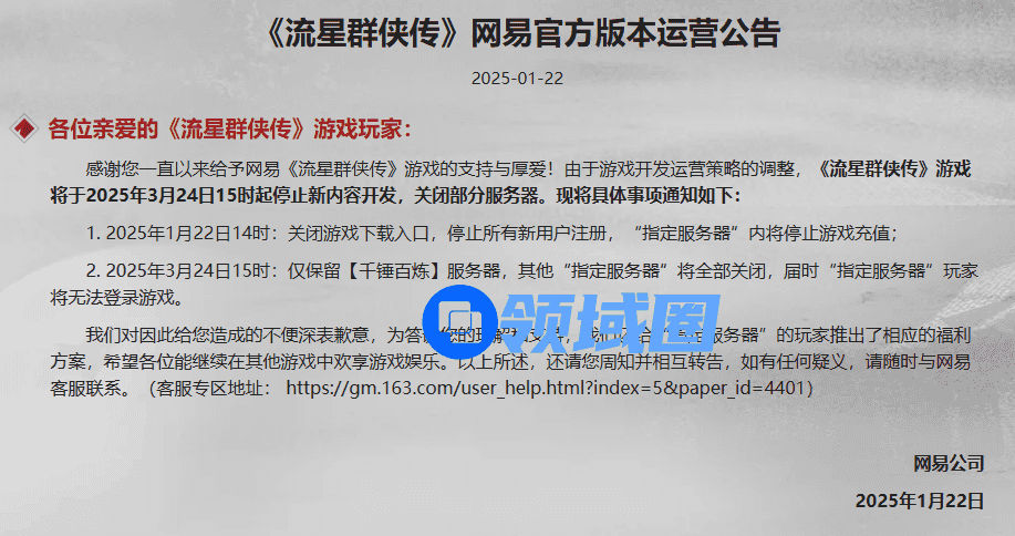 昨(22)日,网易宣布《流星群侠传》手游在当日停止下载,并将于3月24日停止新内容更新,届时将仅保留“千锤百炼”服务器,其它“指定服务器”将全部关闭。