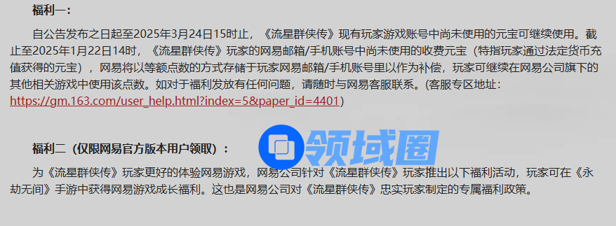 运营公告介绍,面向“指定服务器”玩家《流星群侠传》拿出福利方案:尚未使用的游戏货币可经由邮箱或手机账号领取,在永劫无间等网易旗下其它游戏中使用该点数。