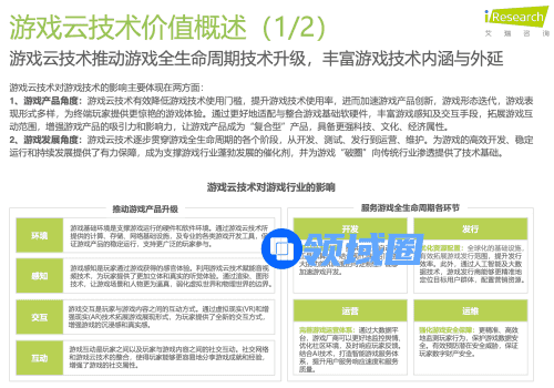 游戏云技术涵盖了游戏研发测试、发行上线、运营增长等全生命周期的服务,它不仅提供强大的计算、存储、网络为代表的基础资源和基础设备,还整合了游戏开发、游戏美术创作、游戏项目管理、游戏测试、游戏安全、游戏数据与运营相关技术,可加速游戏技术创新,推动游戏技术向传统行业渗透,受到越来越多游戏厂商的青睐。