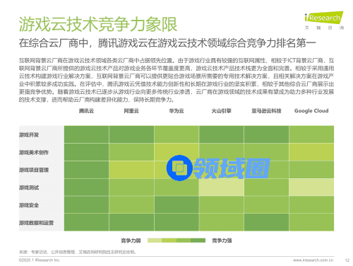 近日,国内权威研究机构艾瑞咨询发布《2025年中国游戏云技术发展洞察报告》(以下简称“报告”),对当前中国游戏云技术的发展现状、竞争力及未来趋势进行了深入剖析。报告指出,在游戏云技术领域,综合云厂商占据主导地位,其中,腾讯云凭借其技术能力和行业积累在游戏云技术领域综合竞争力排名第一。