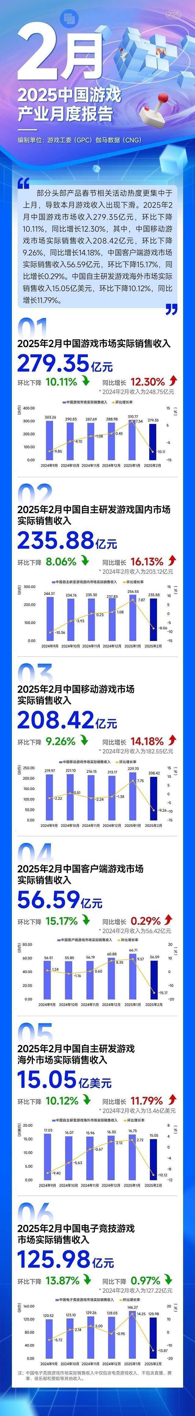 2025年2月中国游戏市场收入279.35亿元,环比下降10.11%,同比增长12.30%,其中,中国移动游戏市场实际销售收入208.42亿元,环比下降9.26%,同比增长14.18%,中国客户端游戏市场实际销售收入56.59亿元,环比下降15.17%,同比增长0.29%。中国自主研发游戏海外市场实际销售收入15.05亿美元,环比下降10.12%,同比增长11.79%。
