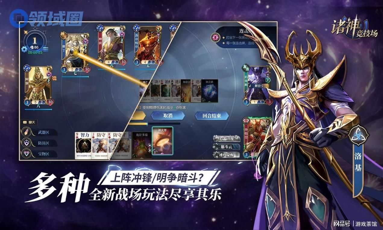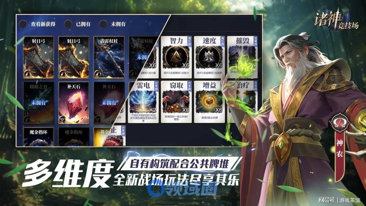 构筑牌:玩家自选的8张个性化卡组,分为装备牌(武器、防具、宝物)和技能牌(如“冥王挽歌”“药王鼎”),需结合神灵属性和战局灵活搭配。例如,某些技能需三维属性达标才能释放(如“四方封印”需力量6、速度6)。