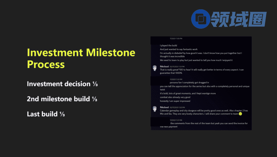 在把版本发送给Kowloon Nights后,投资总监通过Discord直接联系了我。他对Demo非常印象深刻,并提议支付给我“下一个里程碑的投资资金”。